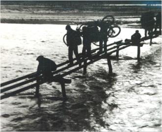 左圖為改造后的備戰(zhàn)橋,右圖為昔日涇河沿岸群眾搭建簡(jiǎn)易木橋過(guò)河的畫(huà)面?! 。ㄡ轻紖^(qū)檔案館供圖)