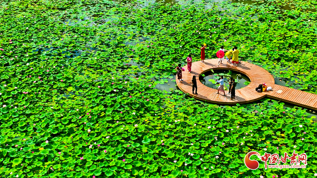 6月30日,雨后天晴的甘肅省張掖國家濕地公園碧水藍(lán)天、綠意盎然,荷塘里的荷花相繼綻放,處處呈現(xiàn)出蓬勃生機(jī),眾多游客和市民在葦溪、湖泊間游玩拍照,親近大自然。