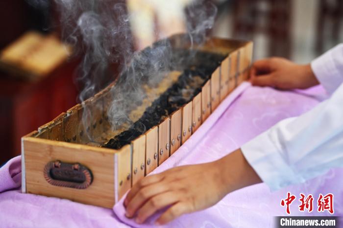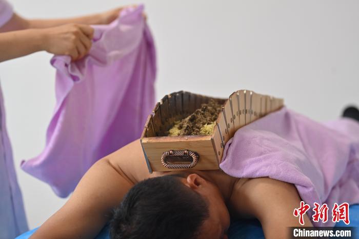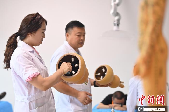 7月16日,甘肅省平?jīng)鍪徐`臺(tái)縣皇甫謐針灸康養(yǎng)館內(nèi),工作人員對(duì)患者進(jìn)行葫蘆灸治療。2006年,靈臺(tái)皇甫謐針灸術(shù)入選第一批甘肅省非物質(zhì)文化遺產(chǎn)名錄。靈臺(tái)作為皇甫謐故里,當(dāng)?shù)孛癖姺浅UJ(rèn)可中醫(yī)康養(yǎng),針灸、拔火罐、推拿、葫蘆灸、火龍灸(督脈灸)等中醫(yī)特色療法受到了很多人的青睞,當(dāng)?shù)毓俜揭餐ㄟ^舉辦大型節(jié)會(huì)等助推中醫(yī)康養(yǎng)產(chǎn)業(yè)發(fā)展。 皇甫謐是針灸醫(yī)學(xué)鼻祖,其《針灸甲乙經(jīng)》已在多個(gè)國家被廣泛傳播應(yīng)用。中新社記者 李亞龍 攝