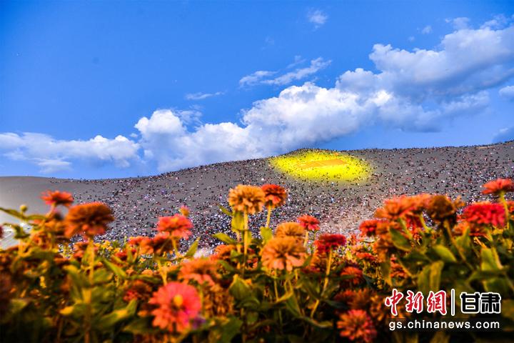 圖為敦煌鳴沙山上,上萬名游客靜待萬人星空演唱會開幕。王斌銀 攝