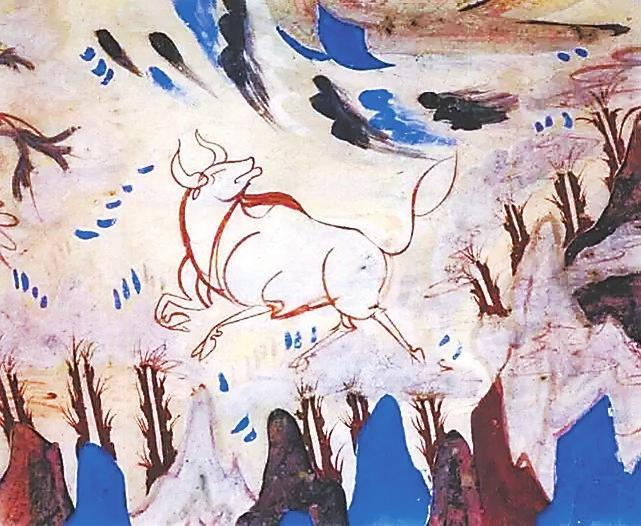 在莫高窟第454窟壁畫中有一幅“耕牛圖”:畫面刻畫了一頭正在勞作的耕牛。畫師用土黃色作為畫面的主色調(diào),將正在馭牛的人只是寥寥數(shù)筆勾勒其形體而已,卻用了醒目的赭紅色來表現(xiàn)一頭牛正在使盡全身力氣耕耘的形象。透過畫面我們能感知到這是一頭“不待揚鞭自奮蹄”的老黃牛。除了描繪在農(nóng)耕生活中勤勤懇懇的耕牛,敦煌壁畫中還描繪了其他形形色色的牛。在莫高窟第249窟壁畫中有一幅“受驚的野牛圖”,畫面上刻畫了一群在山林間閑庭信步的野牛,它們神色安詳自若。忽然一只矯健的猛獸疾馳而至,其中一頭牛受驚回首。這些均被技藝精湛的畫師惟妙惟肖生動勾勒而出。我們看到一只肌肉健碩、神態(tài)生動的野牛幾乎要從壁畫中呼之欲出,令人唯恐避之不及。還有在莫高窟第61窟壁畫中有一幅“金牛宮圖”,這是“黃道十二宮”中的其中一幅圖。所謂的“黃道十二宮”就是今天所說的十二星座,畫面中的金牛體態(tài)豐滿,神態(tài)安詳,牛的敦厚忠誠、樸實溫馴、勤勉勞作、默默無聞的精神贏得了人們的信任。