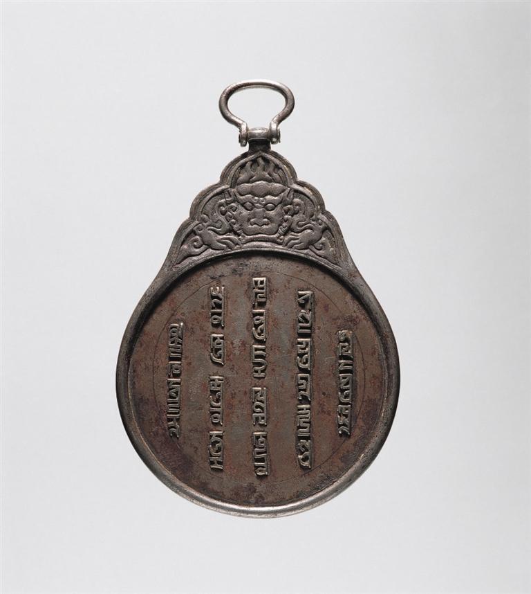 八思巴文虎頭銀符鐵牌,元代,符牌兩面鑲嵌八思巴文銀字,譯為“上天眷命,皇帝聖旨:如不欽奉虔敬,治罪”。廓外上有葉狀鈕座,座內(nèi)鑄虎頭紋,座頂有橢圓形環(huán)鈕。這種虎符圓牌專為傳遞“軍情急務”而設,持之可進出全國各地及四大汗國,域跨歐亞,故有“國際通行證”之稱,是研究元代急遞制度以及政治史、民族文字等方面的珍貴實物資料。這種符牌使用范圍十分嚴格,故全世界現(xiàn)存數(shù)量極少。