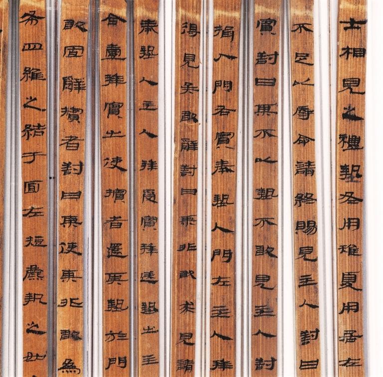 《儀禮》簡,西漢,武威磨嘴子出土。分木質(zhì)和竹質(zhì)兩種,共496枚,編為甲、乙、丙三本,系先編后寫。甲本為《儀禮》17篇中的7篇,乙本僅存《服傳》一篇,丙本僅存《喪服》一篇。該簡冊保存基本完好,與傳世的鄭玄注本不同,應是目前所見《儀禮》的最古寫本,在版本??鄙嫌泻芨叩膬r值,且書寫工整秀麗,是漢代墨寫隸書的上品。