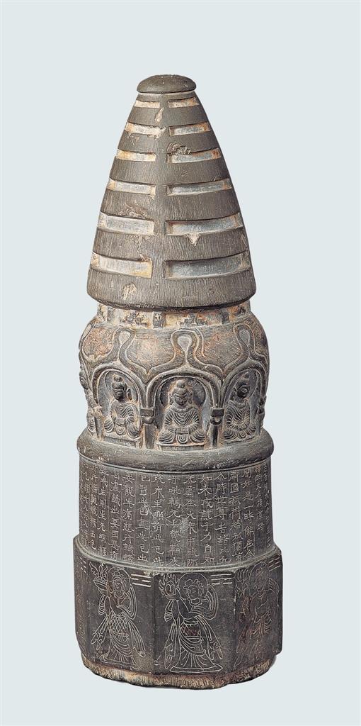 高善穆石造像塔,1969年甘肅省酒泉市出土。寶蓋、相輪、塔頸、塔肩、塔基一應俱全,底部有榫頭。寶蓋頂端中間刻北斗七星,塔腹陰刻《增一阿含經(jīng)·結禁品》的前半部分及發(fā)愿文,有承玄元年(公元428年)紀年。塔基為八面形,每面陰刻一像,像左側上方刻八卦符號。該造像塔是現(xiàn)存北涼石塔中保存最完整的一件,在造型上繼承了犍陀羅供養(yǎng)小塔的基本造型特征,又有了新的發(fā)展,如塔頂端的北斗七星,塔基的八卦符號等,體現(xiàn)出佛教文化和中國本土文化之間的碰撞和融合,是研究早期佛教藝術和佛教思想的重要標本。