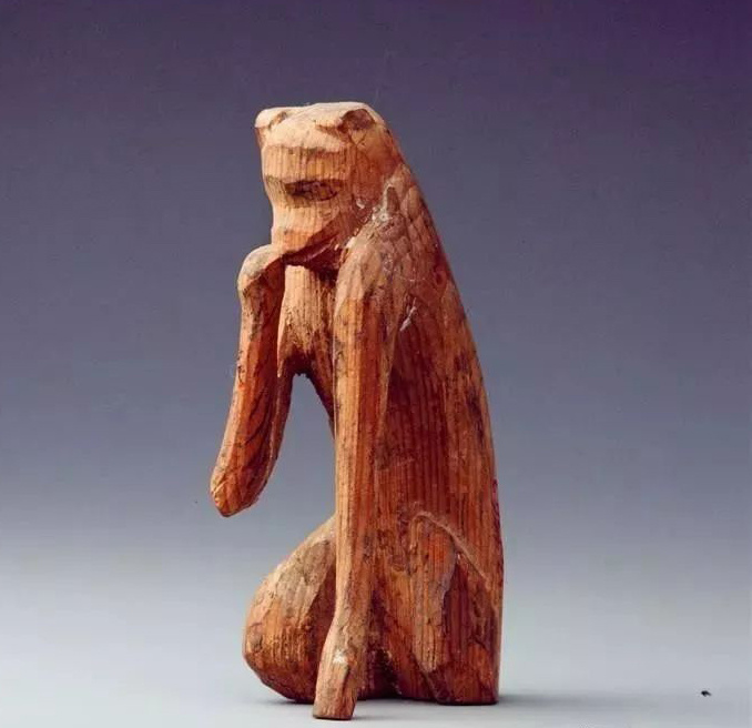 木猴,東漢,1957年甘肅武威磨嘴子出土。此猴跪坐,頭微低,左前肢垂直撐地,右前肢伸至嘴部,似在抿嘴偷笑,又似在品嘗食物。整個雕塑用黑、紅兩色彩繪,形體小巧,刀法簡練,將一只調皮的猴子微感惶惑的瞬間神態(tài)刻畫入微。該作品用一塊木頭雕成,是漢代雕刻中的佳作。