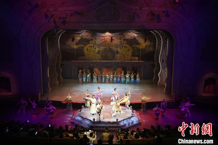 9月5日晚,甘肅敦煌旅游熱度不減,眾多游客觀看大型洞窟式沉浸體驗(yàn)劇《樂(lè)動(dòng)敦煌》。該劇溯源敦煌文化,借助對(duì)莫高窟壁畫(huà)、藏經(jīng)洞古籍進(jìn)行解讀,用全息投影、3D威亞等高科技手段,以全沉浸式的呈現(xiàn)方式,演繹西域少年追尋藝術(shù)的傳奇故事。劇中運(yùn)用了琵琶、排簫、阮等民族樂(lè)器及仿制敦煌古樂(lè)器的音色,通過(guò)胡旋舞、腰鼓舞、琵琶舞等典型舞蹈,展現(xiàn)了敦煌壁畫(huà)中的樂(lè)舞盛景,全面展現(xiàn)敦煌傳承千年的樂(lè)舞文化魅力。九美旦增 攝