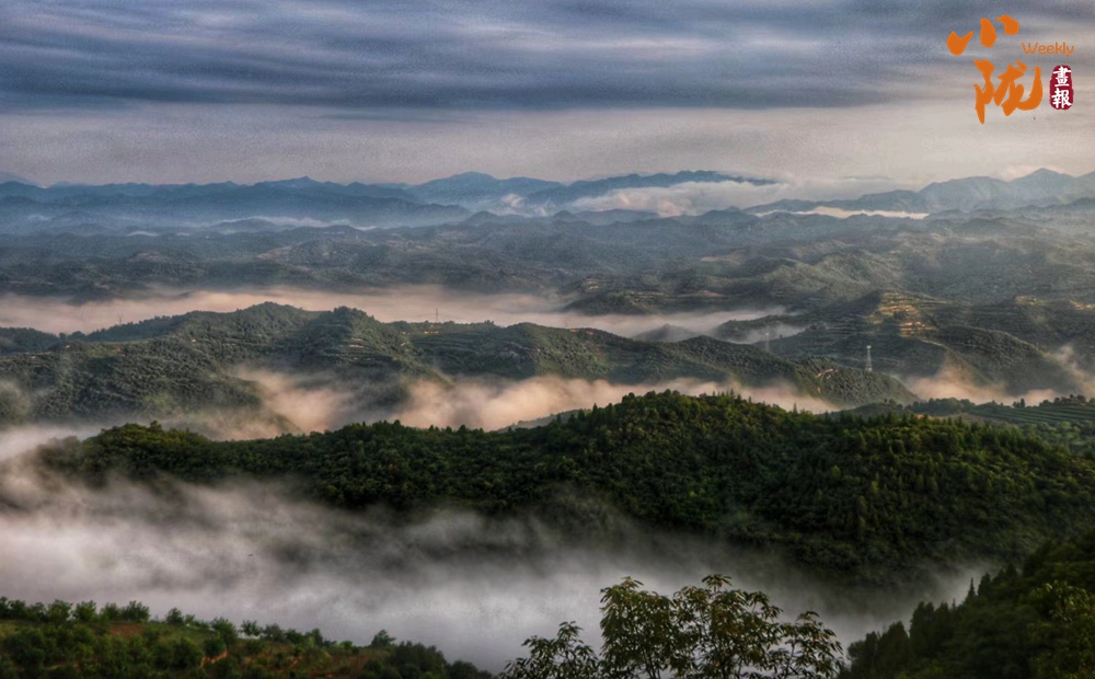 云開霧散、日照山澗,在夕陽映照下彌漫開來的云霧像涂上了一層金黃色,大地、山川顯得格外瑰麗。