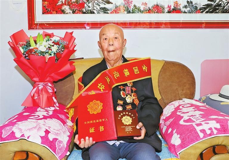 當天,平川區(qū)武裝部、退役軍人事務局的工作人員為胡占學帶來了“全國模范退役軍人”榮譽證書、勛章和綬帶,并為老人佩戴了勛章。