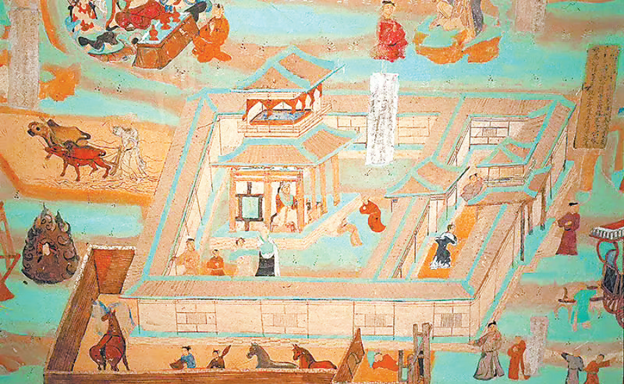 如莫高窟北魏第257窟“須摩提女緣品”圖中宅院的三面就有城垣圍繞,一側(cè)有門樓,院內(nèi)有堂,堂后有四層望樓,樓后有園,墻頂雙線,代表土墻上加筑的女墻。宅第的墻垣上有突出并高于城垣的墩臺顯示出城墻的防御功能。