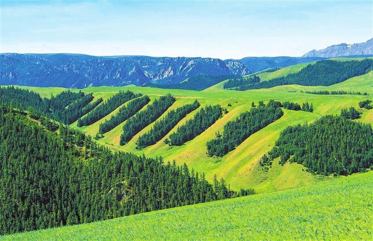 站在山頂一處觀景平臺(tái),放眼四周,滿目蒼翠,層巒疊嶂。祁連云杉環(huán)繞半山腰,山杏、樟子松、沙棘等樹木縱橫成行,微風(fēng)拂過,綠浪涌動(dòng)。