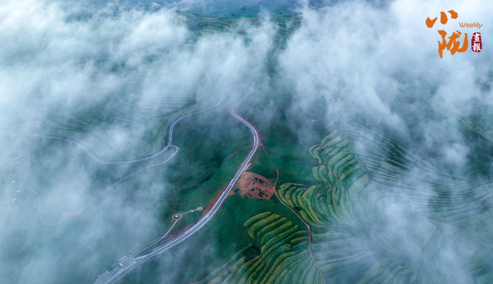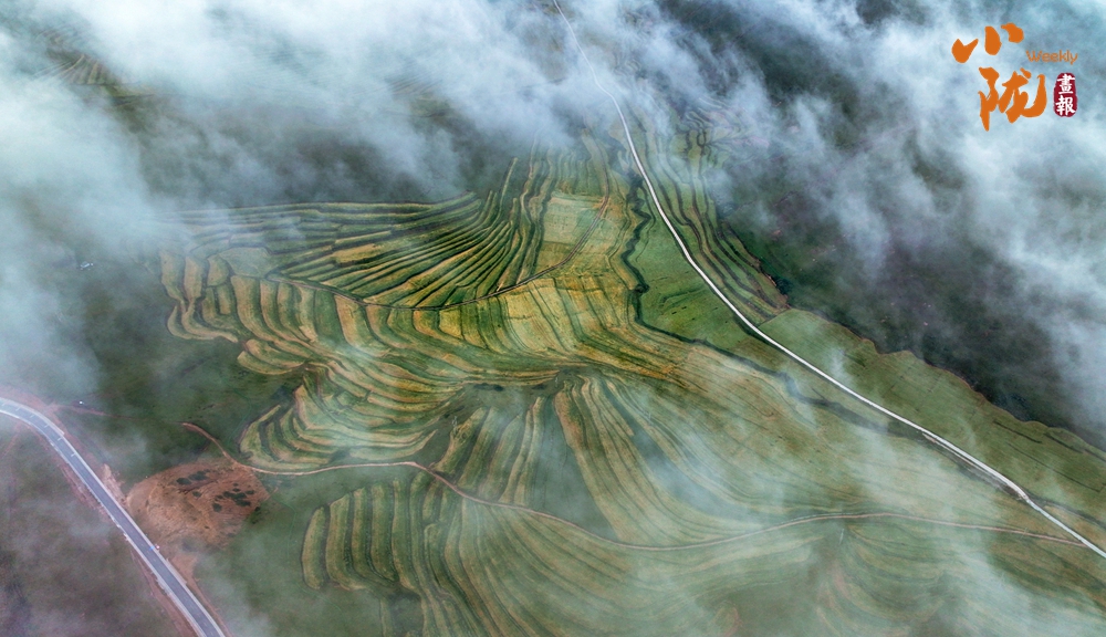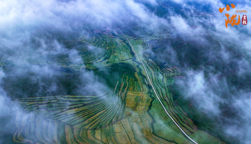 俯瞰大地,云霧飄飄,綠色梯田,縱橫交錯(cuò)、順山而變,宛如一條條彩帶,在山間飛舞。