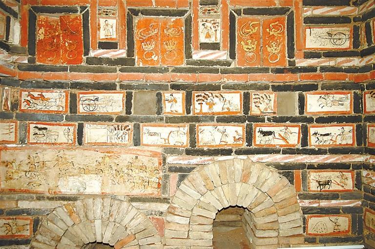 魏晉十六國磚畫在墓中的布局、組合,體現(xiàn)出 “滿”和“層”的特點(diǎn)。整個墓室,各方位、各邊角以及過道均鑲砌畫磚。以嘉峪關(guān)果園—新城5號墓畫磚的布局為例,各層間隔、同層緊鄰的畫磚,給觀者的感覺就是整幅壁畫,但每一塊又是一個獨(dú)立的畫面,這種“樣式”,是魏晉十六國時期的河西匠工、畫工,在繼承漢晉磚室墓的同時,將畫像磚在墓室布局的方式也加以接受。艷麗的色彩,“忠實”生活的寫實手法,又是河西畫匠們的創(chuàng)新和發(fā)揮。