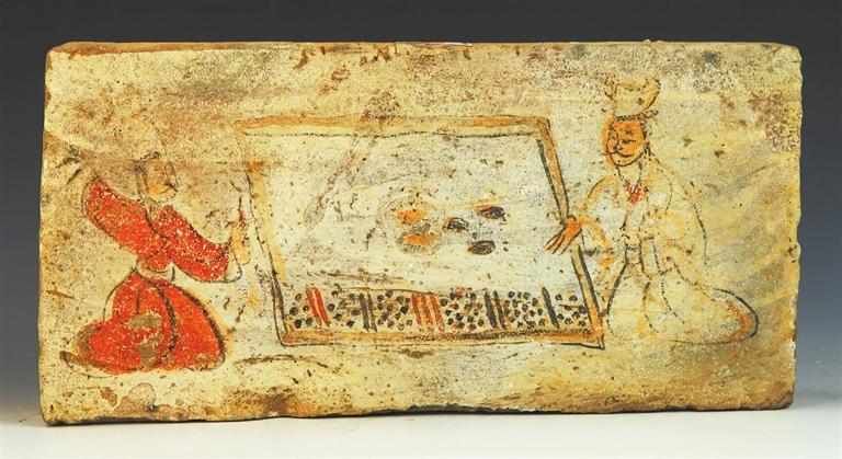 除此之外,河西彩繪壁畫磚圖像中,還有一些反映娛樂的圖像,主要有樂舞圖和六博圖。高臺地埂坡壁畫中的“角抵百戲”中,一著辮者在作表演,他小腿部網(wǎng)狀綁腿,蹲踞,雙手?jǐn)傞_,似乎是在表演魔術(shù),又似乎是在歡迎到場的人們。“擊鼓”中,兩人網(wǎng)狀繃腿,髡發(fā)梳辮,著黑裝者背鼓,著紅裝者持雙鼓槌準(zhǔn)備擊鼓。孫機(jī)先生謂,戰(zhàn)國迄漢盛行六博,博具和博戲的圖像在考古資料中不乏其例。甘肅以武威磨嘴子漢墓出土木六博俑為例。六博俑以簡單明確的藝術(shù)造型,刻畫了兩個老者全神貫注博弈的場面,惟妙惟肖地表現(xiàn)出對弈時蓄勢待發(fā)的場面。在高臺壁畫墓中的博戲場面略有不同,二博者戴船形帽,打手勢。從相貌看,很可能是少數(shù)民族。高臺出土彩繪壁畫磚上,兩人動作幅度更大,左邊一人的黃紅色著裝和博具上的零散物品,顯得場面更為熱烈激情。