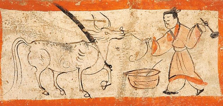 在彩繪畫像磚圖像中,反映家宴娛樂的占了相當(dāng)大的比例,這類題材的畫像磚在敦煌、嘉峪關(guān)、高臺等地都有出土。家宴的過程,通過屠宰—備宴—宴飲等環(huán)節(jié)完整地展示出來。屠宰有椎牛、宰羊等場面。家宴時,主人席地而坐,女仆搖扇伺候。嘉峪關(guān)果園—新城墓中出土有椎牛的圖像,椎牛者右手牽韁,左手舉錘,一器皿是用來盛放牛血的。在高臺地埂坡壁畫中的家宴“對酌圖”,則描繪的是二人戴帽著袍,酒酣耳熱,左邊一人持耳背杯,做敬酒狀,右邊一人作揖謙讓的景象。