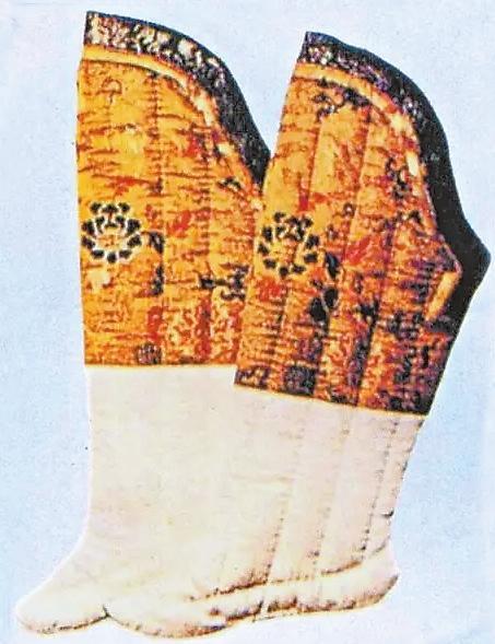 漢代的“夾襪”就是一種棉襪,這種襪子較單層襪厚實(shí),里外兩層,故名。湖南長(zhǎng)沙馬王堆漢墓中曾出土過(guò)兩雙夾襪,由雙層素絹縫成,襪面用絹較細(xì),襪里用絹較粗。這是女襪,出土?xí)r放置在棺木邊箱的竹笥之內(nèi),從襪子當(dāng)隨葬品來(lái)分析,那時(shí)襪子已是生活中必備衣物。