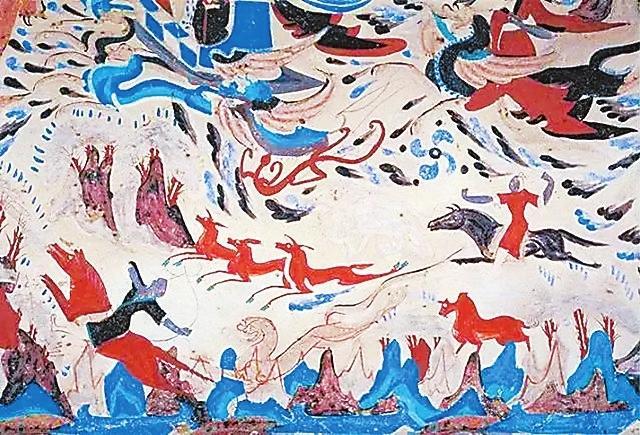 在莫高窟第249窟壁畫(huà)中有一幅“行獵圖”:畫(huà)面上都是些體型巨大的動(dòng)物,有體態(tài)矯健的猛虎、疾馳俊逸的鹿群、整裝待發(fā)的獅子等,有在奔馳的駿馬上拈弓搭箭窮追不舍的獵人,還有在飛奔的駿馬上淡定轉(zhuǎn)身從容射虎的獵人。整個(gè)畫(huà)面既緊張又美好,使人不由得對(duì)畫(huà)師精湛的技藝心悅誠(chéng)服。唐代詩(shī)人王維在詩(shī)作《觀獵》中寫(xiě)道:“風(fēng)勁角弓鳴,將軍獵渭城。草枯鷹眼疾,雪盡馬蹄輕。忽過(guò)新豐市,還歸細(xì)柳營(yíng)?;乜瓷涞裉帲Ю锬涸破?。”意思是說(shuō)將軍的獵騎,飛馳在渭城的近郊。風(fēng)中傳來(lái)呼嘯的弦聲。已枯的野草,擋不住尖銳敏捷的鷹眼,積雪后飛馳的駿馬馬蹄會(huì)愈加輕盈。據(jù)文獻(xiàn)記載,唐宋時(shí)期人們打獵時(shí)多有一種“西北望,射天狼”的豪情!在莫高窟第85窟壁畫(huà)中還有一幅“行獵圖”就形象地反映了唐人狩獵的情景:畫(huà)面上的四個(gè)健碩獵人正在整裝出獵,他們著裝統(tǒng)一:頭戴幞頭,身穿缺胯衫,足蹬半腰靴。打獵的裝備也很不同:有人胳臂上架鷹、有人單手牽犬、有人持弓挎箭囊,甚至還有一人手持利斧。