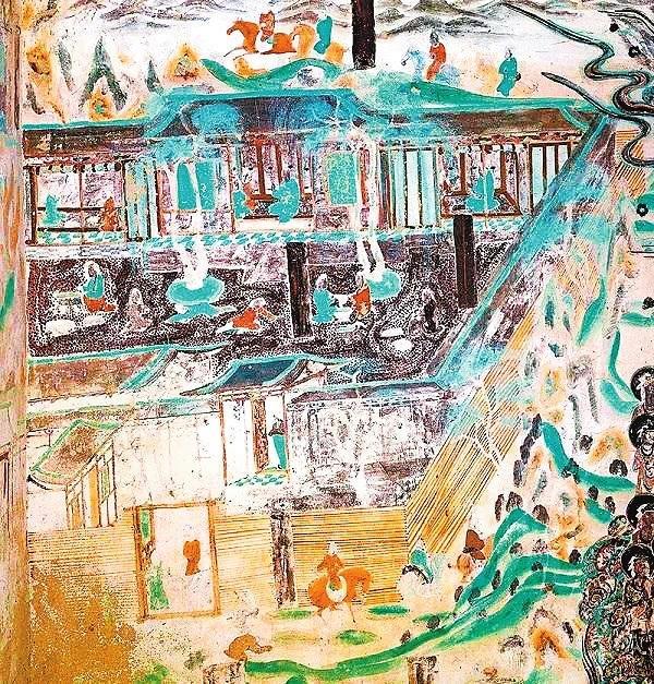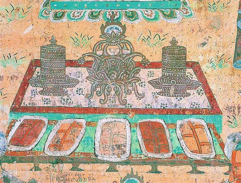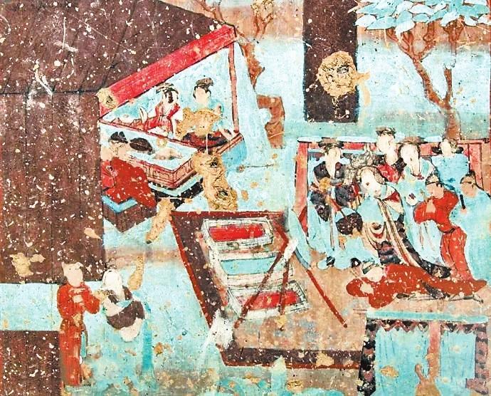 古人會(huì)在一年的歲末舉行一次集體聚會(huì),稱(chēng)作“建福”。在敦煌文獻(xiàn)《社司轉(zhuǎn)帖》中寫(xiě)道:“右緣常年建福一日,人各爐餅壹雙,凈粟壹斗。幸請(qǐng)諸公等,帖至限今月廿二日卯時(shí)于安家酒店取齊。”意思是說(shuō),只要有可能,每年到了年末大家都要選擇一日來(lái)進(jìn)行建福。每家每戶(hù)需要按時(shí)把準(zhǔn)備建福的物資送過(guò)來(lái)。唐朝詩(shī)人李白在《客中行》一詩(shī)中寫(xiě)道:“蘭陵美酒郁金香,玉碗盛來(lái)琥珀光。但使主人能醉客,不知何處是他鄉(xiāng)。”意思是說(shuō)蘭陵美酒甘醇甜美,就像郁金香一樣芬芳四溢。興來(lái)盛滿(mǎn)玉碗,泛出琥珀光晶瑩迷人。主人端出如此好酒,定能醉倒他鄉(xiāng)之客。飲酒之后哪能分清故鄉(xiāng)與他鄉(xiāng)呢?歲暮聚飲蘊(yùn)含有辭舊迎新、攘兇納吉的美好愿望。在莫高窟第12窟壁畫(huà)中有一幅“帳篷酒肆圖”:畫(huà)面中圍坐在條形長(zhǎng)桌兩邊正盡興暢飲的客人為七人,還有兩個(gè)熱情忙碌的服務(wù)人員。整個(gè)畫(huà)面是一幅酒酣耳熱、興致高昂的歡飲圖。更為氣勢(shì)恢宏、熱鬧非凡的是莫高窟第23窟壁畫(huà)中一幅“院落圖”:畫(huà)面中分院落之內(nèi)與院落之外兩個(gè)部分,院落之內(nèi)是世俗的世界,畫(huà)面上布局著鱗次櫛比的廳堂房屋,有人正在庖廚、有人正在對(duì)弈、有人正在暢聊、有人正在團(tuán)聚,也有人正在說(shuō)教,總之表現(xiàn)的是我們?nèi)粘I畹陌賾B(tài)。院落之外是佛國(guó)世界,整體呈現(xiàn)出肅穆莊嚴(yán)之感。有趣的是在佛國(guó)與世俗世界中間,畫(huà)的是服飾艷麗,騎馬遠(yuǎn)行的人們。