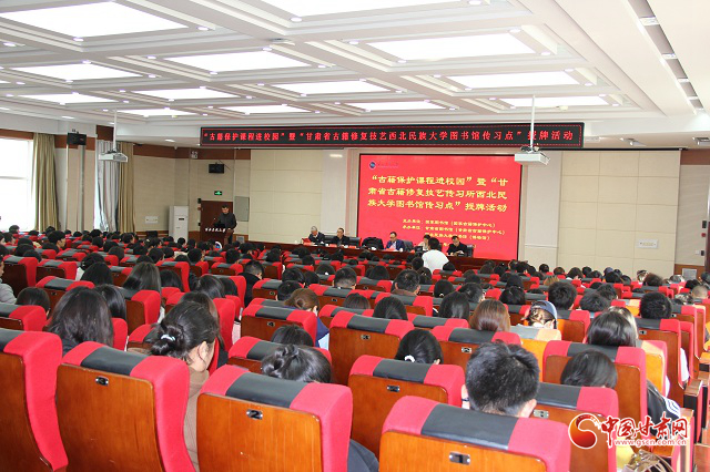 18日下午,由國家圖書館(國家古籍保護(hù)中心)主辦,甘肅省圖書館(甘肅省古籍保護(hù)中心)與西北民族大學(xué)聯(lián)合承辦的“古籍保護(hù)課程進(jìn)校園”活動暨“甘肅省古籍修復(fù)技藝傳習(xí)點”授牌活動在西北民族大學(xué)舉行。