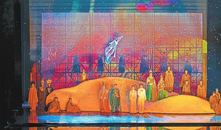 大型原創(chuàng)音樂(lè)劇《飛天》以“大愛(ài)”立意敘事,打破時(shí)空界限,利用現(xiàn)代舞美技術(shù),多維度、多角度、多層次地展現(xiàn)了敦煌石窟的無(wú)窮魅力,令觀(guān)眾身臨其境、沉浸其中,情感共鳴油然而生,獲得獨(dú)特的藝術(shù)體驗(yàn)。(本文配圖均為《飛天》劇照,由蘭州大劇院提供)