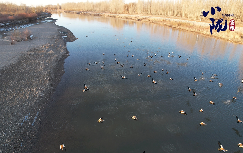 萬物復蘇,臨澤黑河濕地白天鵝、赤麻鴨等棲息覓食,構成了一幅和諧的生態(tài)美景。