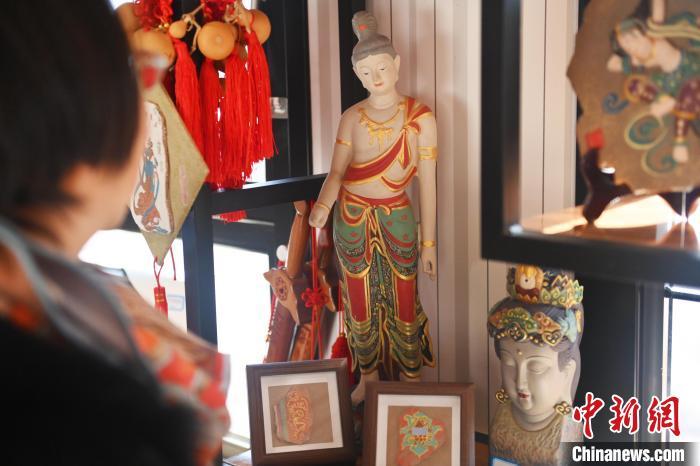 2月8日,甘肅省蘭州市城關(guān)區(qū)“非遺年貨購物月”活動(dòng)現(xiàn)場(chǎng),游人挑選敦煌系列文創(chuàng)產(chǎn)品。中新社記者 李亞龍 攝