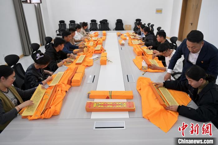 2月27日,在甘肅甘南藏族自治州碌曲縣益西達(dá)吉科技有限公司內(nèi),工作人員正在進(jìn)行藏文古籍?dāng)?shù)字化相關(guān)工作。該公司主要從事民族古籍?dāng)?shù)字化建設(shè)和古籍文獻(xiàn)數(shù)據(jù)庫建設(shè),自2019年以來,承擔(dān)西藏、四川、甘肅等省區(qū)的藏文古籍?dāng)?shù)字化項目。圖為工作人員對藏文古籍(木刻版)做數(shù)字化工作前期準(zhǔn)備。中新社記者 九美旦增 攝