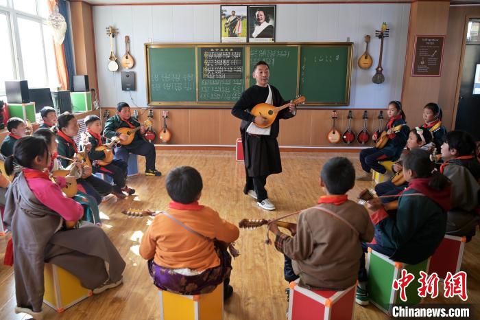 2月26日,甘肅省甘南藏族自治州瑪曲縣寄宿制藏族小學(xué)龍頭琴彈唱社團(tuán)活動,加措正在教孩子們彈唱。九美旦增 攝