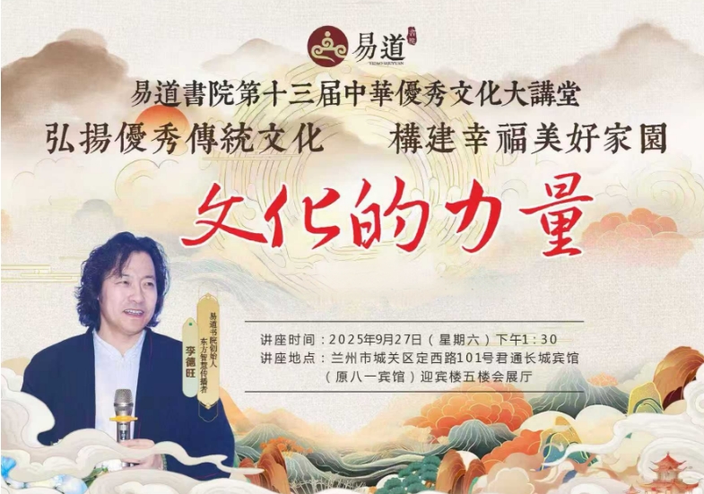 響應時代號召,弘揚傳統(tǒng)文化,旨在文化賦能行業(yè)發(fā)展,易道書院第十三屆中華優(yōu)秀文化大講堂將于9月27日在蘭州君通長城賓館(原八一賓館)迎賓樓五樓會展廳開講,誠邀有志之士共襄盛舉,學習傳統(tǒng)文化,賦能行業(yè)文明,構(gòu)建美好家園!