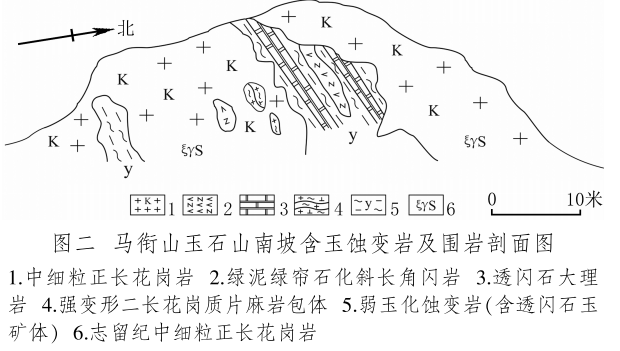 馬銜山玉礦分布在馬銜山東南部的玉石山(圖版一),海拔3028米。山上出露的地質體主要為古元古界馬銜山巖群、中元古代片麻二長花崗質巖[3]和志留紀正長花崗巖及正長巖。馬銜山巖群的巖性為黑云斜長片麻巖、變粒巖、斜長角閃巖和白云質大理巖,巖石普遍遭受了韌性變形,變余糜稜巖發(fā)育。志留紀巖漿侵入期后熱液活動較強,石英脈細脈發(fā)育,局部見螢石礦化或礦床[4]。玉礦化主要產于馬銜山巖群與志留紀正長花崗巖和正長巖接觸帶上(圖版二),具體賦存在與白云質大理巖的接觸部位,是正長花崗巖及正長巖與鎂質大理巖接觸交代蝕變的產物[5]?;◢弾r與片麻巖、變粒巖和斜長角閃巖接觸界線附近巖石雖有蝕變,但不見玉化蝕變巖或玉石出露。在近山頂開采玉石揭露的一個地質剖面清晰地顯示了這些特征(圖二)。該剖面大致呈東西走向,長約50米,馬銜山巖群多呈殘留體出露,斜長角閃巖綠泥綠簾石化強烈,大理巖普遍發(fā)生蝕變,形成透輝透閃石大理巖,緊靠花崗巖接觸地帶發(fā)育窄窄的透閃石玉礦帶。現(xiàn)在人們找玉,也主要在該剖面上的花崗巖和鎂質大理巖的接觸帶上鑿洞,在接觸帶上見有多處采挖玉石的洞穴。在該剖面西側約50米,發(fā)育有正長巖與大理巖的混染帶,肉紅色正長巖中包裹混染著大量灰綠色透閃透輝大理巖,部分已蝕變?yōu)橥搁W透輝石巖,且質地較細膩,成為半玉化巖石。剖面和周圍地質特征表明,玉礦的形成是早古生代志留紀花崗質雜巖體侵入到古元古代鎂質大理巖,發(fā)生接觸交代蝕變作用的結果,在兩種巖石接觸帶形成玉礦體。但并不是蝕變帶中的巖石都是透閃石玉石,透閃石玉在蝕變帶中多呈雞窩狀或不規(guī)則狀分布,少量呈脈狀出露。從剖面及部分采坑的規(guī)模來看,玉礦體向深處有變大、變好的趨勢,這主要受控于接觸面產狀,在傾角較緩處礦體相對較大。橫向上在背離接觸面方向圍巖具有從透閃石玉到透閃透輝石玉、透閃透輝石大理巖再到含透閃石大理巖的變化特征,反映了交代蝕變強度與接觸帶溫度及熱液成分變化的密切關系。從玉礦體到蝕變圍巖由于成分和結構的變化出現(xiàn)一系列不同類型的玉石或巖石。我們在剖面上采集到一些小塊的淡綠色玉料(圖版三)和出露較寬的微晶大理巖,經(jīng)偏光顯微鏡下薄片鑒定和XRF檢測,確定有透閃石玉、透輝透閃玉、透閃透輝石玉、透閃透輝石大理巖和含透閃石大理巖等,這與馬家窯遺址出土的齊家文化時期大部分玉質品玉料類型基本一致[6]。部分地段近礦圍巖還有透輝石巖、透輝矽卡巖、矽卡巖化大理巖、蛇紋石化大理巖、斜長透輝石巖等。玉石山的采洞(坑)由于資源與環(huán)境保護的要求,大多已被填埋,但仍可見采坑殘留的位置。采洞(坑)均位于大理巖與正長花崗巖接觸帶靠近大理巖一側,這也間接顯示了玉礦體的位置。此外,玉石山花崗巖中石英細脈較發(fā)育,局部可見螢石礦化,反映了花崗巖侵入期后低溫熱液活動仍較強,對玉礦也有一定的改造影響。