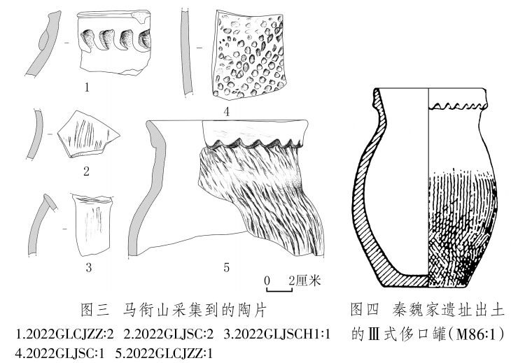 陶片 2片,2022GLCJZZ∶1,罐殘片,夾砂紅陶,腹部以下缺失。侈口,上有煙熏痕跡。短頸,頸上部有一圈鋸齒狀凸飾,鼓腹,頸部和腹部滿飾粗繩紋。復原口徑12、器壁厚0.6~1、殘高10厘米(圖三,5)。與秦魏家遺址出土的齊家文化Ⅲ式侈口罐(圖四)[16]形制相似。2022GLCJZZ∶2,罐口沿殘片,夾砂紅陶??谘叵掠性卵罓罡郊佣鸭y??谘貧堥L5.3、殘高4.8、厚0.7厘米(圖三,1)。