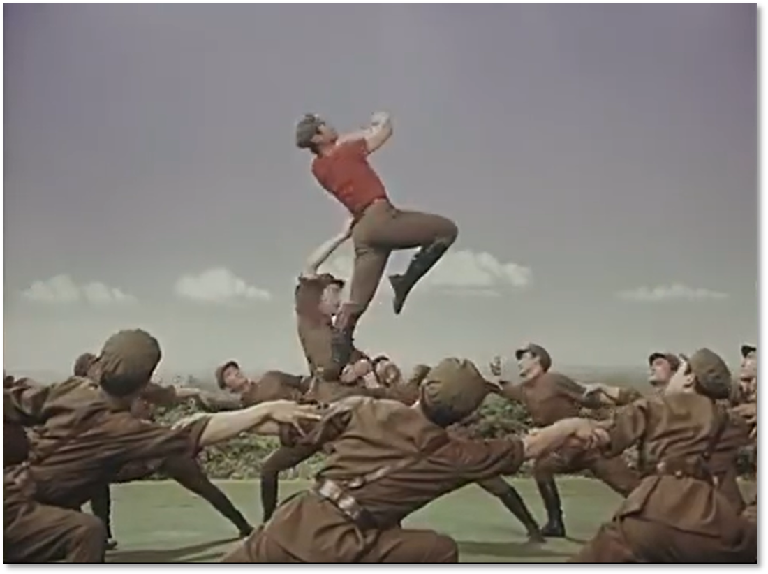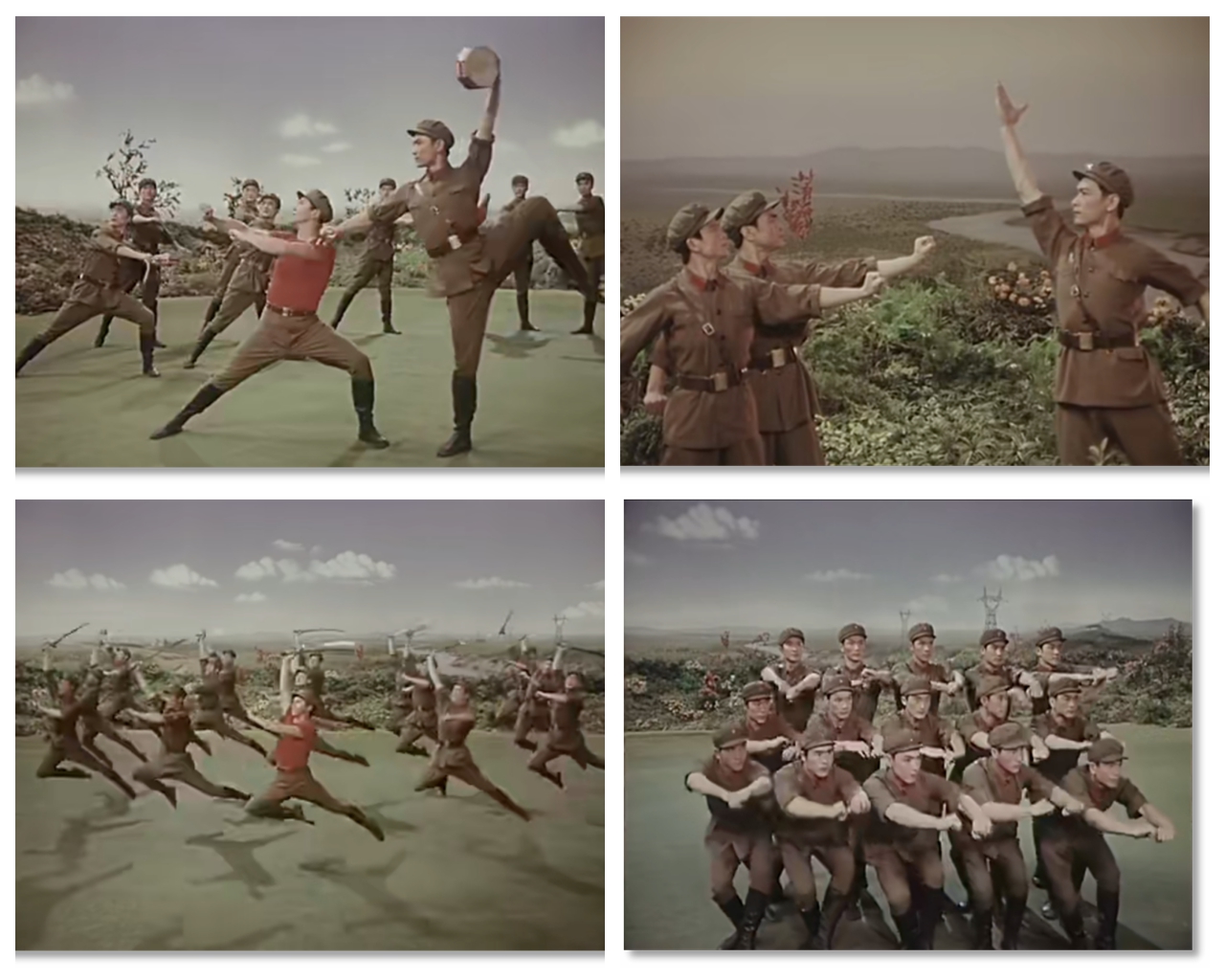 有趣的是,膠片并非被動(dòng)記錄,它悄然行使著選擇的權(quán)力——它決定了后世的人們將以何種視角、何種景別來銘記《戰(zhàn)馬嘶鳴》。在鏡頭中定格下來的膠片拷貝,就此定義了經(jīng)典的面貌。從舞臺(tái)到膠片,作品完成了一次關(guān)鍵的媒介化轉(zhuǎn)身,從一場(chǎng)限時(shí)演出,變身為一個(gè)時(shí)代的文化符號(hào)。這使軍藝精神在沒有數(shù)字媒體的時(shí)代,得以廣泛流傳和保存。