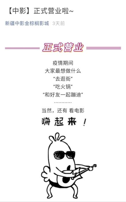 微信公眾號截圖 新疆中影金棕櫚影城近日開始營業(yè)