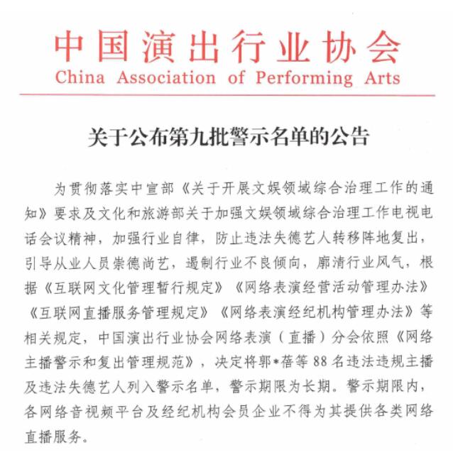 中國演出行業(yè)協(xié)會網(wǎng)絡(luò)表演(直播)分會近日發(fā)布了第九批網(wǎng)絡(luò)主播警示名單,包括“鐵山靠”“郭老師”兩名職業(yè)主播和“吳亦凡”“鄭爽”“張哲瀚”三名演員在內(nèi)的88名主播將在行業(yè)內(nèi)被實(shí)行聯(lián)合抵制和懲戒。這是違法失德藝人首次被納入網(wǎng)絡(luò)主播警示名單中,防止劣跡藝人轉(zhuǎn)移陣地復(fù)出。