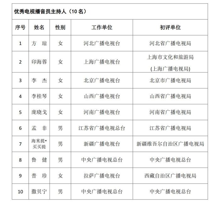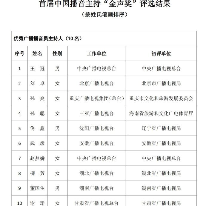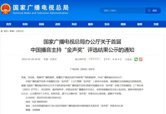 《通知》指出,根據(jù)《國家廣播電視總局辦公廳關(guān)于組織參加中國廣播電視節(jié)目獎(jiǎng)•首屆中國播音主持“金聲獎(jiǎng)”評(píng)選工作的通知》(廣電辦發(fā)〔2021〕277號(hào)),經(jīng)過初評(píng)、復(fù)評(píng)和終評(píng),評(píng)選出優(yōu)秀廣播播音員主持人、優(yōu)秀電視播音員主持人各10名。現(xiàn)將評(píng)選結(jié)果予以公示,公示期為5個(gè)工作日。