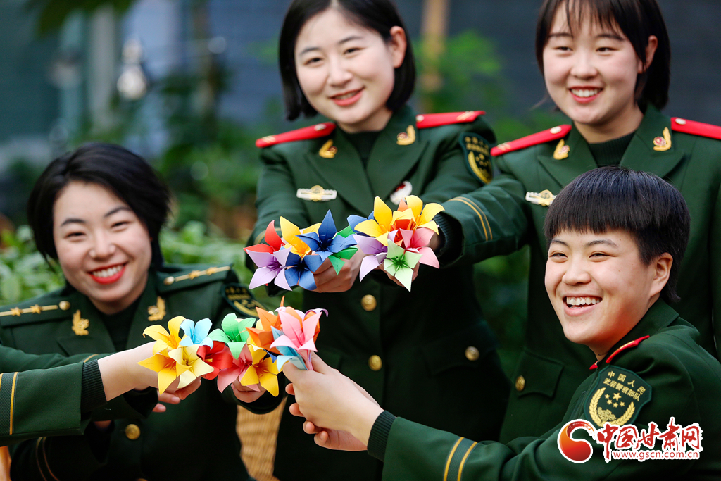 蘭州支隊十七中隊女兵通過折千紙鶴和百合花喜迎節(jié)日的到來。
