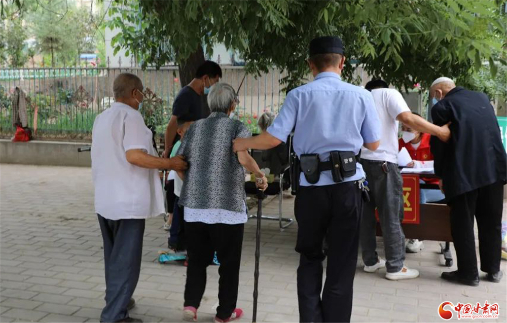 紅古分局海石灣派出所民警在核酸采樣點(diǎn)主動(dòng)攙扶行動(dòng)不便的老人進(jìn)行核酸采樣。紅古分局 張 鼎/攝