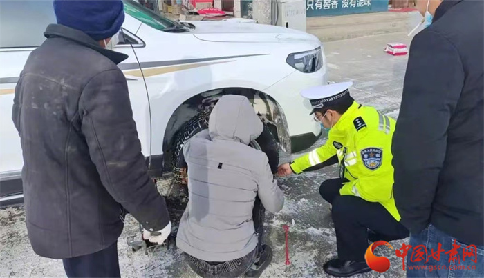 12月16日,永登縣公安局交警大隊民警為受困群眾安裝防滑鏈。