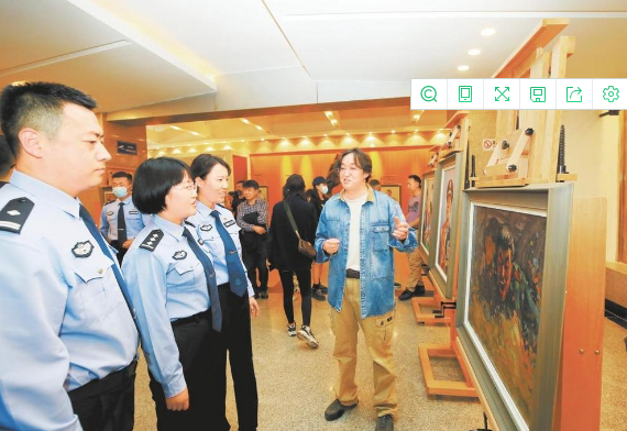 畫像作者向民警講述作品創(chuàng)作過程中如何選題、明確作品主題以及表現(xiàn)形式