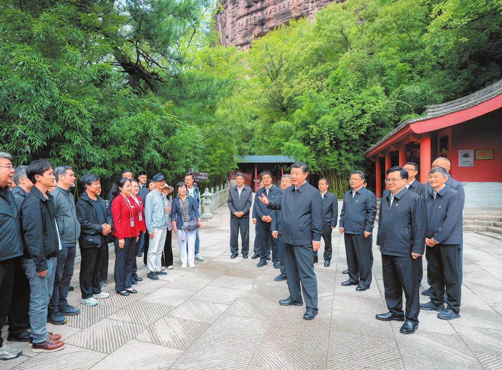隨后,習(xí)近平來到麥積山石窟,沿著棧道仔細(xì)察看距今1600多年的洞窟和雕塑、壁畫,同保護(hù)修復(fù)工作人員親切交流。習(xí)近平說,我國(guó)四大石窟是中華文明的瑰寶,都具有重要的歷史價(jià)值、文化價(jià)值。他希望文物工作者賡續(xù)“莫高精神”,潛心為國(guó)護(hù)寶,為傳承創(chuàng)新中華優(yōu)秀傳統(tǒng)文化、增強(qiáng)中華文化影響力作出更大貢獻(xiàn)。
