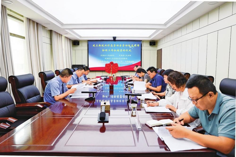 民勤縣檢察院邀請法院、人社、司法、工會、婦聯(lián)等部門單位召開座談會,共同簽訂《關(guān)于建立新就業(yè)形態(tài)勞動者勞動權(quán)益保障協(xié)同工作機制的意見》(2024年6月7日拍攝)。