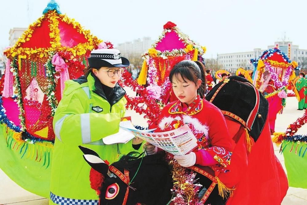 2月12日,榆中縣公安局交警大隊聯(lián)合蘭州市公安局交警支隊走進社火演出現(xiàn)場開展“美麗鄉(xiāng)村行”交通安全巡回宣講活動。新甘肅·甘肅法治報記者王輝攝