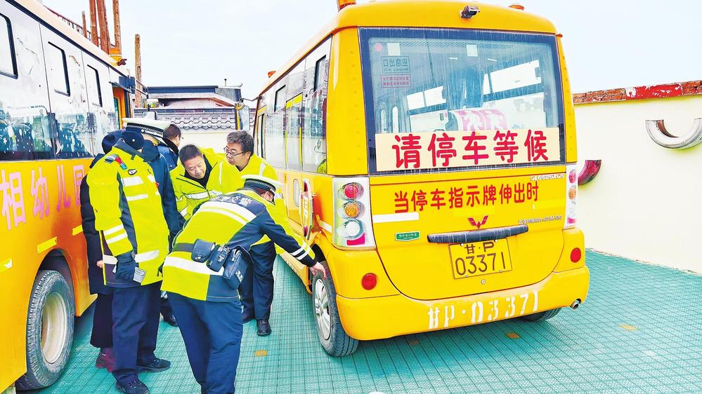 民警在檢查幼兒園校車。開學(xué)在即,為保障學(xué)生上下學(xué)乘車安全,2月18日,臨潭縣公安局交警大隊聯(lián)合縣交通運輸局對校車開展“安全體檢”。 新甘肅·甘肅法治報記者金凡裕攝