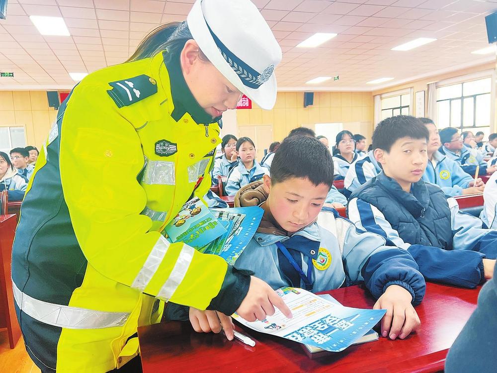 民警向學生講解交通安全知識。2月26日,臨潭縣公安局交警大隊組織民警走進臨潭縣回民中學,開展交通安全進校園宣傳活動。 新甘肅·甘肅法治報記者金凡裕攝