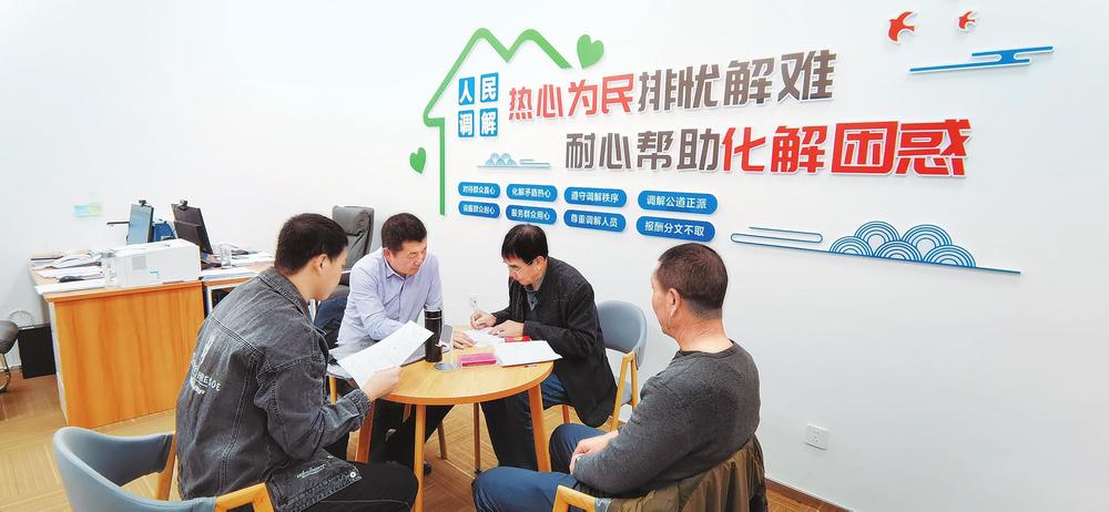 天??h綜治中心組織金牌調(diào)解員、律師等在遠(yuǎn)程視頻調(diào)解室為群眾調(diào)解矛盾(資料圖)。