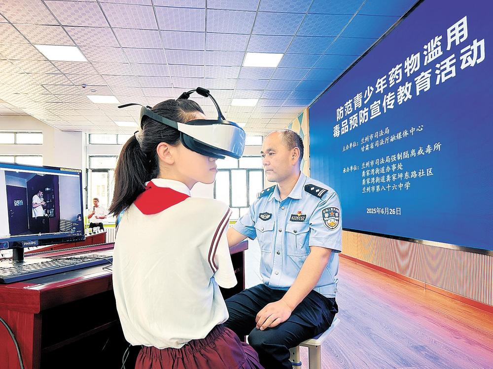 2025年6月26日,蘭州市司法局強(qiáng)制隔離戒毒所干警走進(jìn)蘭州市第八十六中學(xué)開展禁毒宣傳教育。圖為學(xué)生佩戴VR眼鏡,通過虛擬現(xiàn)實(shí)技術(shù)創(chuàng)造逼真的沾染毒品場(chǎng)景,讓學(xué)生身臨其境地感受毒品的危害。