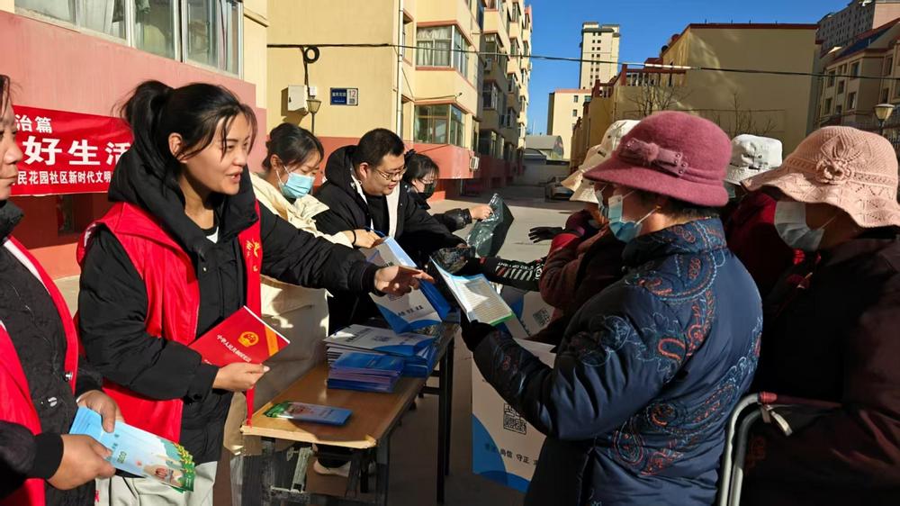 工作人員在社區(qū)內(nèi)開展普法宣傳活動(dòng),向居民發(fā)放法律宣傳資料。