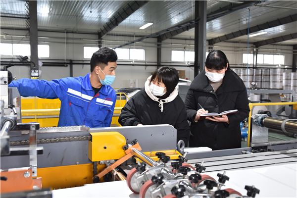 為切實(shí)幫助復(fù)工復(fù)產(chǎn)企業(yè)解決實(shí)際困難,安徽省滁州市南譙區(qū)紀(jì)委監(jiān)委女干部們組成“巾幗服務(wù)隊(duì)”,深入企業(yè)生產(chǎn)加工車間,開展調(diào)研走訪,跟進(jìn)督促政策落實(shí)。(安徽省滁州市南譙區(qū)紀(jì)委監(jiān)委 孫煒 攝)