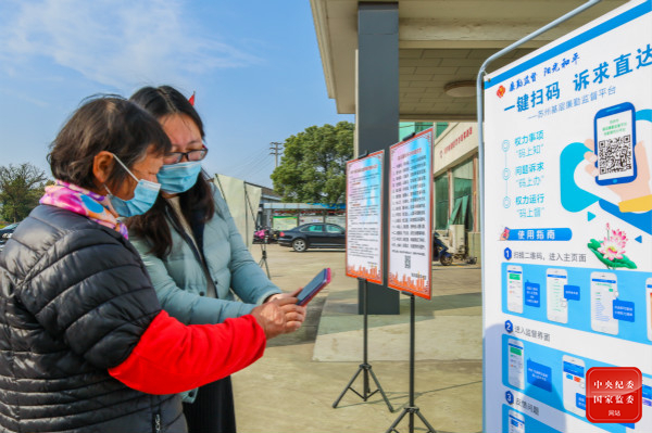 江蘇省張家港市紀委監(jiān)委聚焦做實監(jiān)督,創(chuàng)新信息化監(jiān)督平臺建設,用“碼上監(jiān)督”推動監(jiān)督下沉、落地見效,維護群眾利益。圖為該市紀檢監(jiān)察干部在南豐鎮(zhèn)永聯(lián)村指導群眾掃碼使用基層廉勤監(jiān)督平臺。(江蘇省張家港市紀委監(jiān)委 供羅燕 攝)