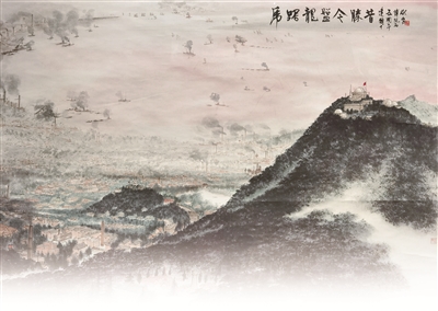 1949年4月23日,人民解放軍占領(lǐng)南京。毛澤東聞?dòng)嵑?,欣然寫下這首詩(shī),描寫了人民解放軍橫渡長(zhǎng)江、解放南京的雄偉壯闊、氣勢(shì)磅礴場(chǎng)面。在畫作中,畫家描繪的是南京城的壯麗景色,沐浴在朝暉之中的紫金山及其周圍景致,以浪漫的詩(shī)意呈現(xiàn)出來(lái)。近處,紫金山巍峨高聳,天文臺(tái)亦清晰可見;中景,江上輪渡往來(lái),兩岸工廠林立,煙霧繚繞;遠(yuǎn)處,紅霞爛漫,水天一色。新中國(guó)成立后的南京繁忙而祥和,墨色淋漓間,新中國(guó)欣欣向榮的景象躍然紙上。