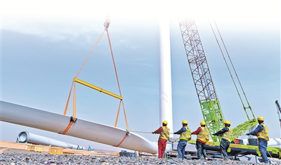 甘肅省高臺縣境內有戈壁荒漠2000多平方公里,近年來憑借風光資源優(yōu)勢,發(fā)力新能源產(chǎn)業(yè)賽道。圖為該縣某新能源風力發(fā)電項目建設現(xiàn)場,工作人員正在安裝風力發(fā)電機。新華社發(fā)